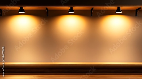 Modern gallery interior with warm lighting and wooden display shelf, ideal for exhibitions