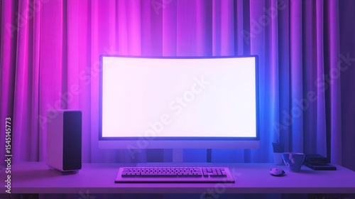 Modern Gaming Setup with Computer Monitor Keyboard and Mouse on Desk with Purple and Blue Lights