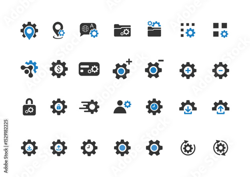 Modern Gear and Settings Icons Set – Flat Black and Blue UI Configuration Symbols for Technology, Software, App Interface, Security, Cloud Upload Download, and Preferences