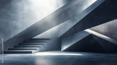 Modern geometric podium stage in close-up, sharp angles lit by dramatic lighting