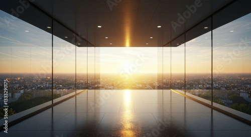 Modern Glass Building Interior with Sunrise Cityscape View