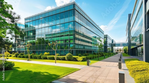 Modern glass buildings surrounded by lush greenery and well-maintained pathways under a clear sky