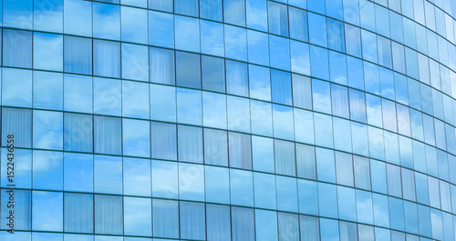 Modern glass facade of an office building with blue sky reflections. Perfect for business, corporate identity, technology, and real estate themes in design or marketing visuals.