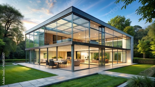 Modern glass house features clean lines, floor-to-ceiling windows, and a minimalist interior, providing a unique blend