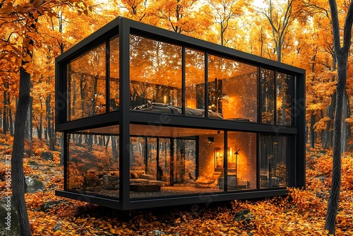 Modern glass house nestled in autumn forest warm golden light glowing inside creating a cozy inviting atmosphere