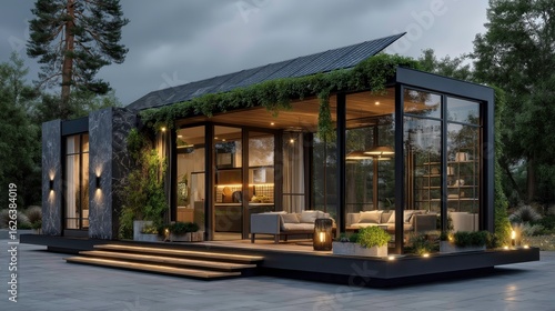 Modern Glass House with Solar Panels in Natural Setting at Night