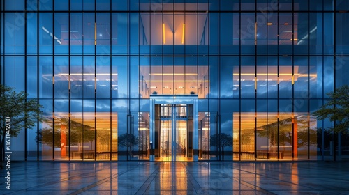 Modern glass office building exterior with bright reflections and illuminated interiors, showcasing sleek architectural design and contemporary style.