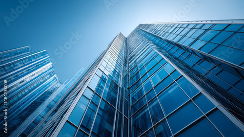 Modern glass skyscraper building with reflective towe into a clear blue sky in a urban cityscape emphasizing architecture and urban development
