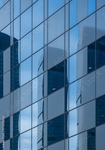 Modern glass skyscraper reflection and vibrant blue sky in urban landscape