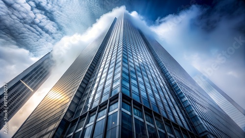 Modern glass skyscraper soaring into cloudy sky
