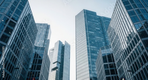Modern glass skyscrapers reaching towards the sky, symbolizing corporate success, economic growth, and urban development in a bustling city