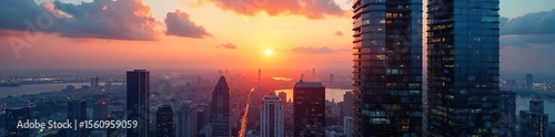 Modern Glass Tower Reflecting City Skyline at Sunset Corporate Success and Real Estate Imagery