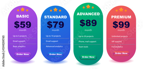 Modern Gradient Pricing Table UI Kit, Basic, Standard, Advanced, Premium Plans