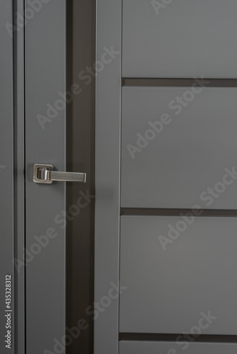 Modern gray door with metal handle in new appartment