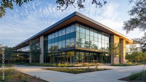 Modern green office building showcasing sustainable architecture and a strong focus on eco-friendly design.