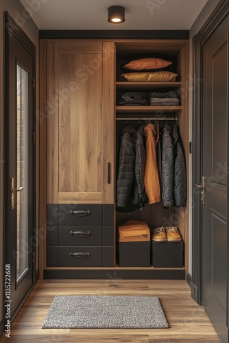 Modern hallway with built-in storage, wooden sliding door, dark grey drawers, coats, shoes, and pillows.