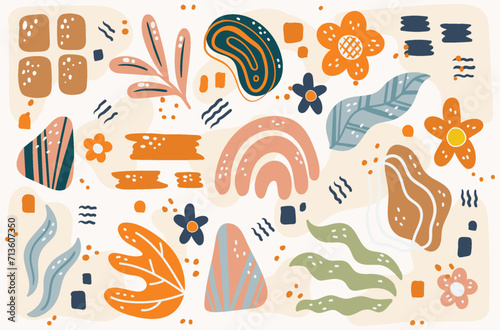 Modern hand drawn plant leaf and tropical shape decoration set. Pastel color doodle bundle for fashion design, summer season or natural concept.