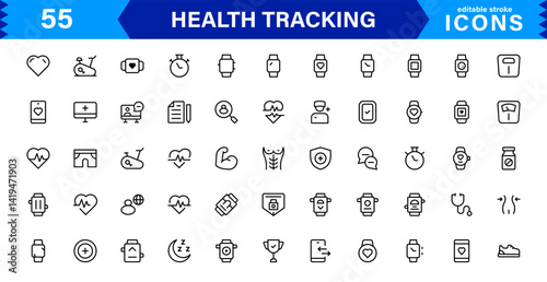 Modern Health Tracking Icon Set Vector Illustration. Featuring Essential Fitness, Activity, and Health Monitoring Symbols