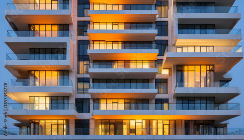 Modern high rise residential building with staggered glass balconies and warm lighting
