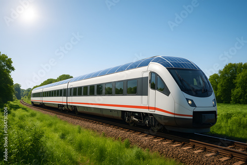 Modern high-speed train with solar panels on the roof riding through green landscape on a sunny day showcasing sustainable transportation innovation