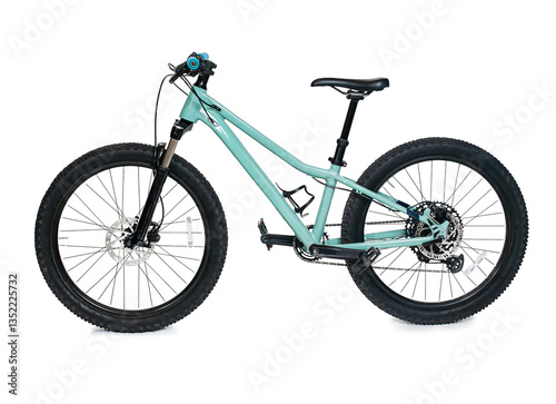 Modern high-tech mountain bike isolated on a white background. Side profile view studio shot. Child size