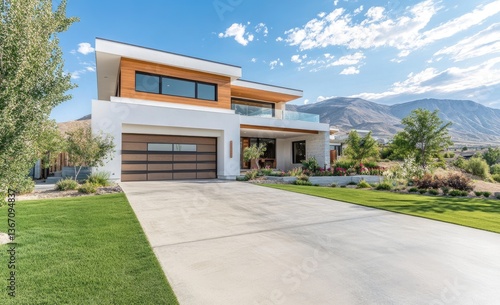 Modern home exterior, sunny day, mountain backdrop, landscaped yard