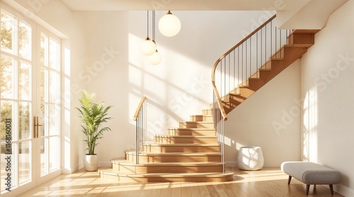 Modern Home Interior with Sunlit Staircase and Elegant Pendant Lights - 1