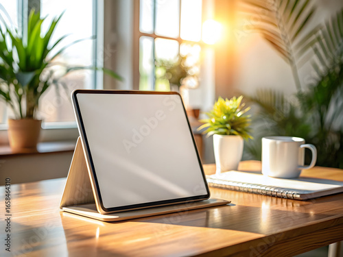 Modern home office desk with tablet and plants in sunlight