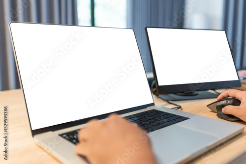 Modern home office setup with laptop and external monitor showing blank white screen. Perfect for design mockup, remote work concept, software development, and tech workspace.