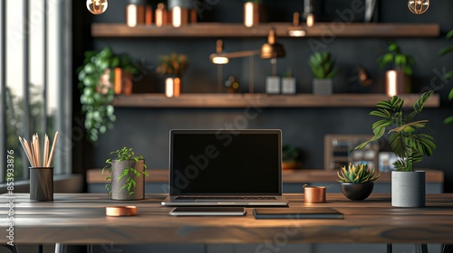 Modern home office with laptop, tablet, plants on wooden desk, stylish shelves, and warm lighting.