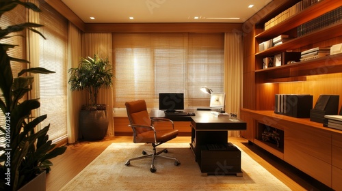 Modern Home Office with Wooden Furnishings and Plants