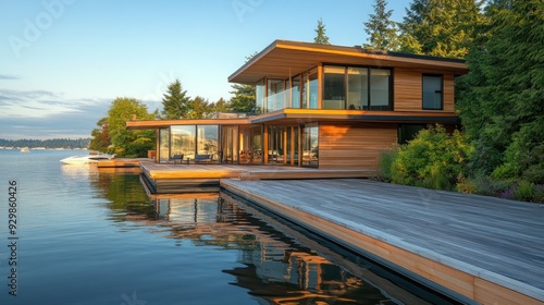 Modern home on the water with a wooden deck and a stunning view.