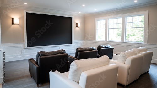 Modern home theater room with black screen, white leather recliners, and large windows.