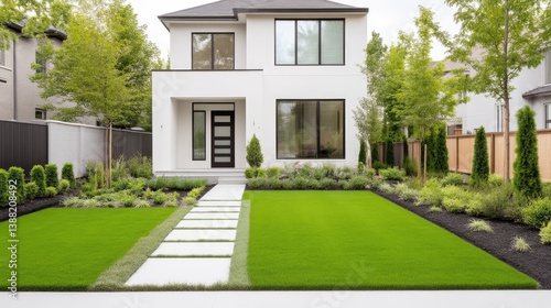 Modern home with manicured landscaping. Well-maintained lawn and walkway lead to the front door of a modern, two-story house, framed by landscaped gardens, trees, and shrubs
