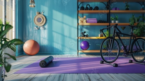 Modern home workout setup with a stylish interior. Purple yoga mat, dumbbells, and indoor exercise bike arranged neatly in a cozy room. Fitness and decor blend together.