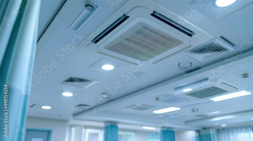 Modern hospital ceiling with air conditioning and lighting fixtures, showcasing clean and sterile environment. design emphasizes functionality and comfort for patients