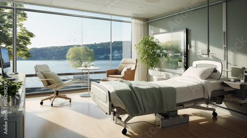 Modern hospital room, calming vibe, patient in bed with large window view, hospital vibe bed, serene healthcare environment