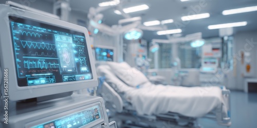 Modern Hospital Room with Advanced Medical Equipment and Monitoring Devices for Patient Care and Treatment in Healthcare Facility Setting