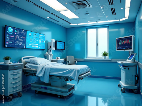 modern hospital room with advanced technology future of healthcare. The room features digital screens medical devices virtual assistant for providing patients personalized care diagnostics. new image