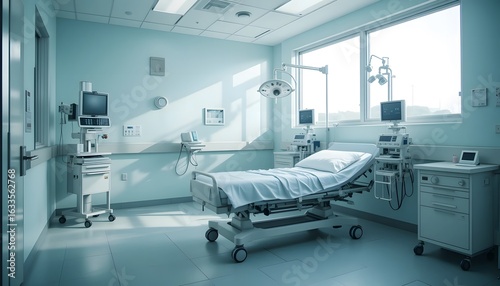 Modern Hospital Room with Medical Equipment and Patient Bed