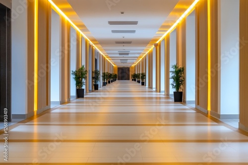Modern Hotel Corridor Interior - Long, bright hallway in a modern hotel, featuring elegant design and soft lighting. Clean lines and potted plants add to the sophisticated ambiance