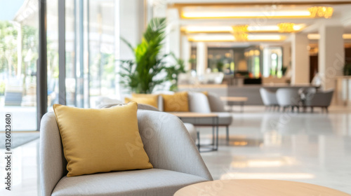 Modern hotel lobby featuring comfortable seating arrangements with gray sofas and yellow pillows, creating a welcoming atmosphere for guests