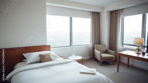 Modern hotel room with large windows and city view