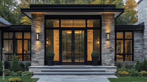 Modern house entrance with large black framed glass doors and windows, stone columns, potted plants, warm interior lighting, and a landscaped garden at dusk