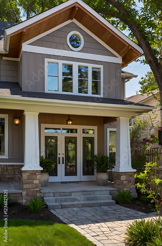 Modern House Exterior Design: Gray Siding, Stone Accents, and a Welcoming Porch. The perfect blend of contemporary architecture and classic charm.