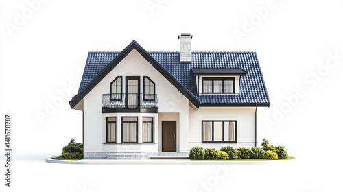 Modern house with blue roof and white facade, surrounded by greenery