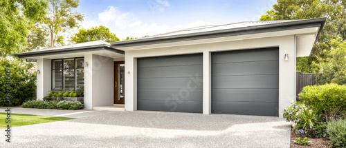 Modern house with double garage entrance and landscaped front yard in bright daylight