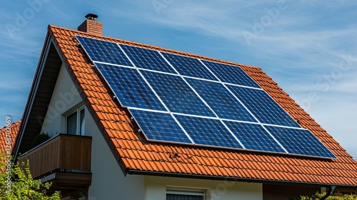 Modern house with solar panels on gable roof, clean design, natural light, sustainable living concept.