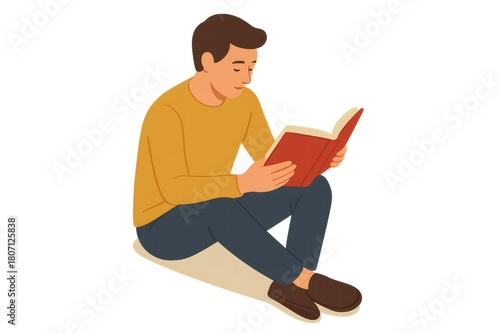 Modern illustration of a young man sitting, engrossed in a red book. Representing learning, hobby, and quiet leisure time