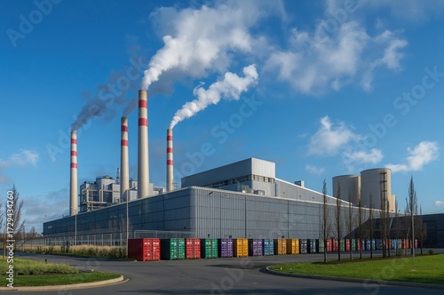 Modern incineration facility emits faint smoke with vibrant containers neatly aligned